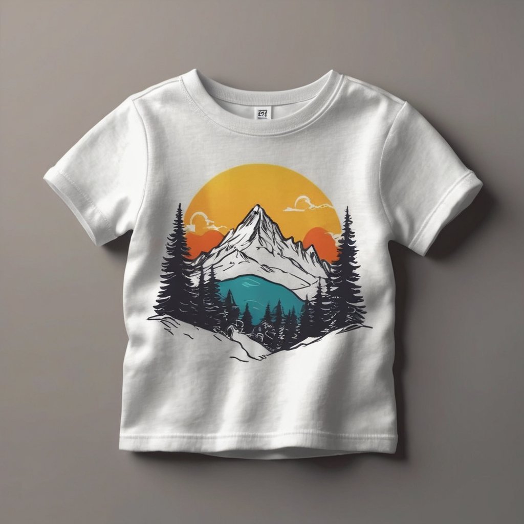 Tee-Shirt motif coucher de soleil en montagne 100% coton. Lavable à l'eau chaude. Anti-allergène.