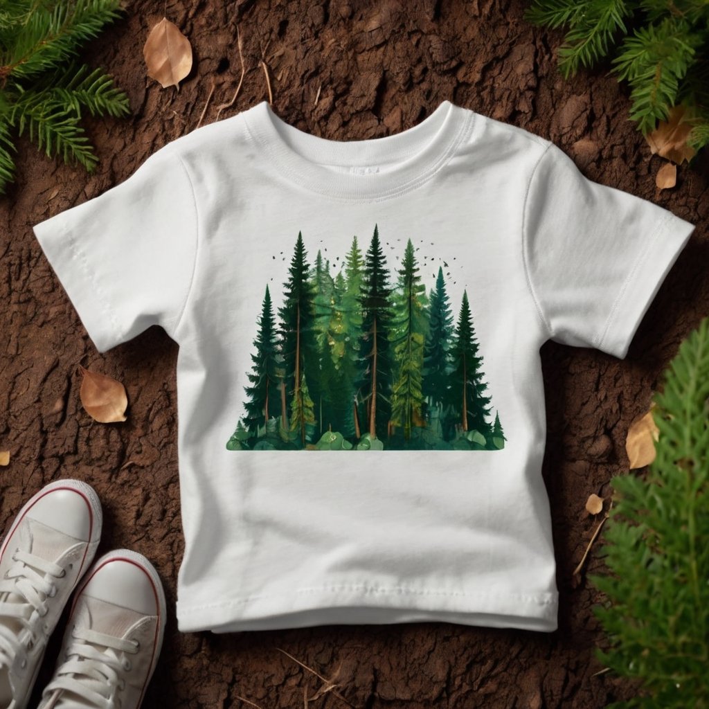 Tee-Shirt motif arbres de forêt. 100% coton. Lavable à l'eau chaude. Anti-allergène.