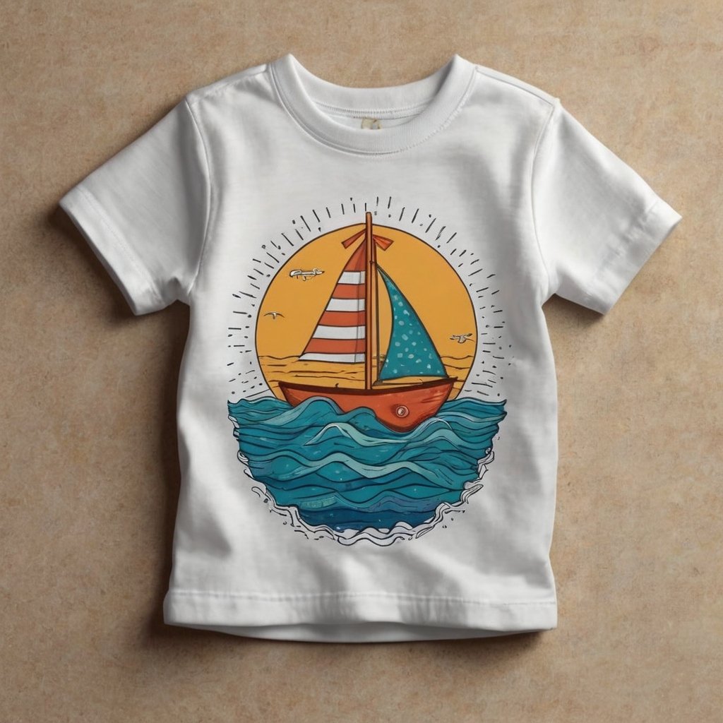 Tee-Shirt motif petit bateau en mer. 100% coton. Lavable à l'eau chaude. Anti-allergène
